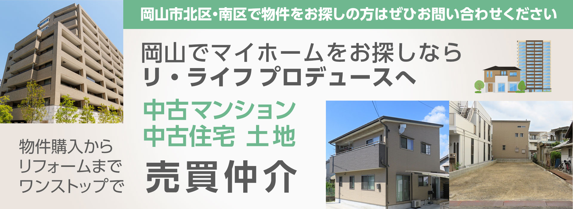 岡山市で土地・中古住宅・マンション購入をご検討中の方はリ・ライフプロデュースまで是非お問い合わせください!(株)リ・ライフ プロデュースは岡山の不動産売買仲介を全力でサポートいたします!土地探し、中古住宅・マンションご購入からリフォーム・リノベーションまで、住まいに関するお悩みをワンストップで解決いたします。岡山での生活をご検討中の方はぜひ実績豊富な私たちにお気軽にご相談ください!